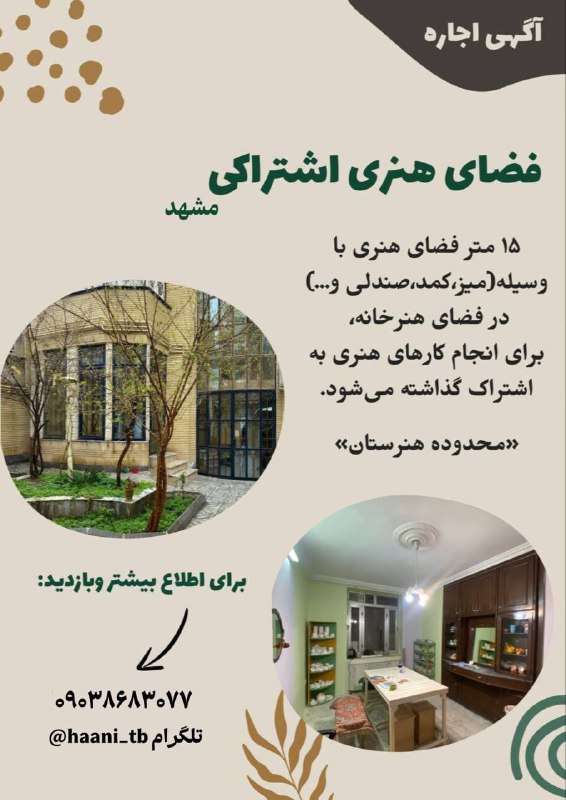 اگر هنرمند هستین و برای انجام کاری هنری(نقاشی، خطاطی، سفالگری، پاپیه ماشه و…) دنبال فضا هستین، اتاقی ۱۵ متری همراه با وسایل به اشتراک گذاشته میشه.