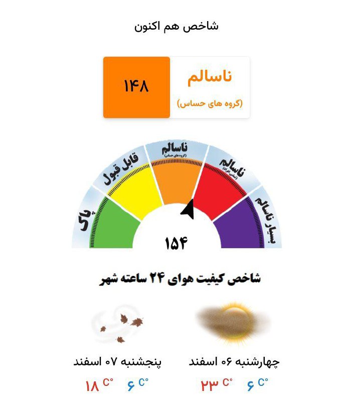 🔹کیفیت هوای مشهد هماکنون با شاخص ۱۴۸ در وضعیت ناسالم برای گروههای حساس قرار دارد.