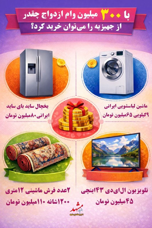 با ۳۰۰ میلیون تومان وام ازدواج چقدر میتوان جهیزیه خرید؟ Posted on فوریه 26, 2026 🔸با ۳۰۰ میلیون تومان وام ازدواج چقدر از جهیزیه را می توان خرید ؟!