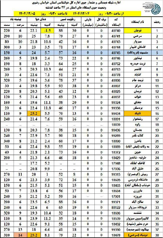 ▪️ وضعیت جوی استان خراسان رضوی طی ۲۴ ساعت گذشته