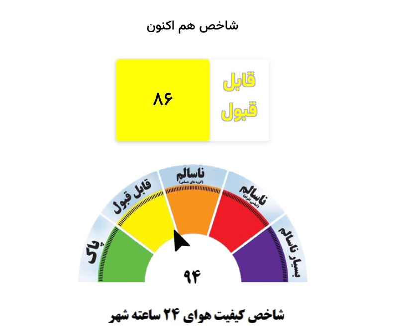 ⚪️کیفیت هوای هم اکنون مشهد قابل قبول 📊شاخص عددی Posted on فوریه 26, 2026 ⚪️کیفیت هوای هم اکنون مشهد قابل قبول 📊شاخص عددی هم اکنون 86 ❄️هواشناسی خصوصی مشهد👇 @MashhadWeather