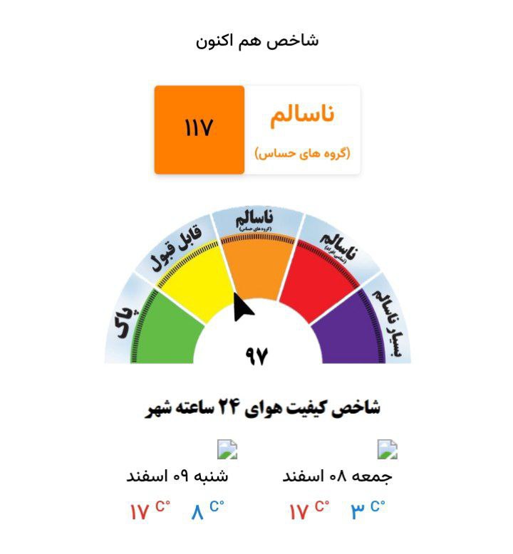 🔹شاخص کیفیت هوای مشهد هم اکنون با شاخص لحظهای ۱۱۷ برای گروههای حساس ناسالم شد.