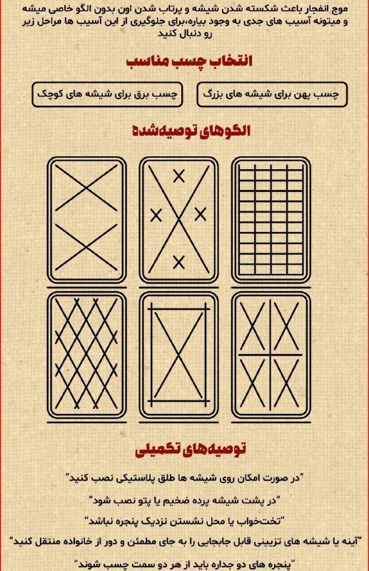 الگوهای کاربردی و توصیه شده چسب زدن شیشه پنجره‌های ساختمان در روزهای بحران