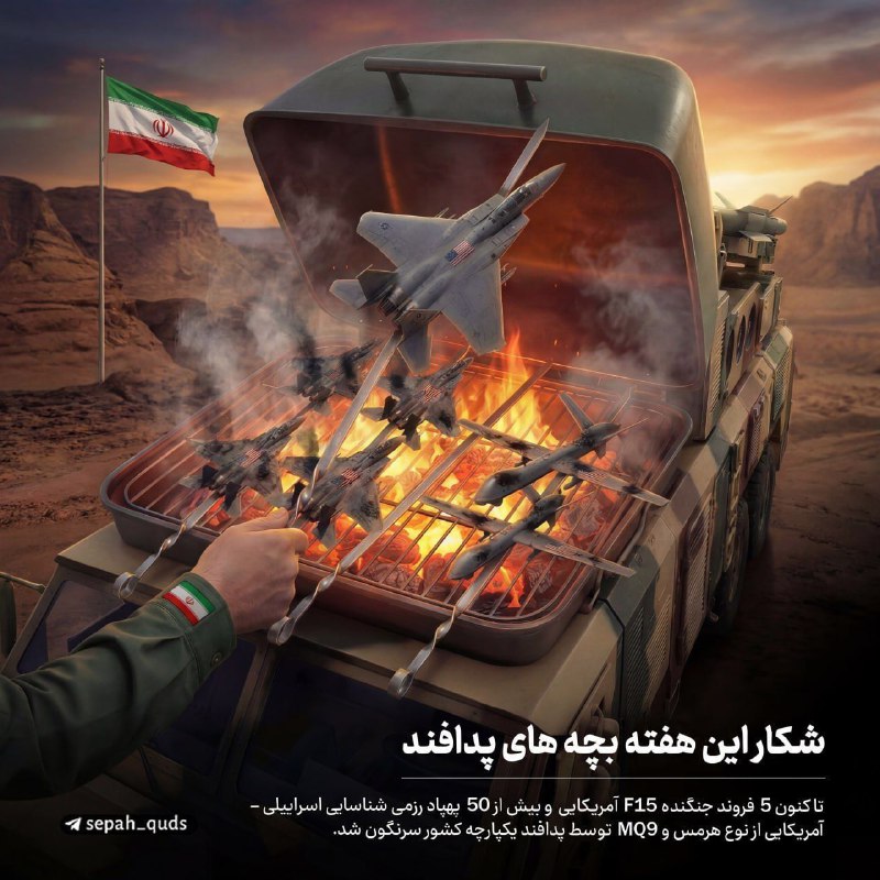 شکار پنج فروند F-۱۵ و بیش از ۵۰ پهپاد رزمی آمریکایی و اسرائیلی توسط بچههای پدافند این هفته Posted on مارس 5, 2026 ▪️ شکار این هفته بچههای پدافند؛ 🔹پنج فروند F-۱۵ آمریکایی و بیش از ۵۰ پهپاد رزمی شناسایی از انواع هرمس، هرون و MQ۹ آمریکایی و اسرائیلی به سیخ کشیده شدند