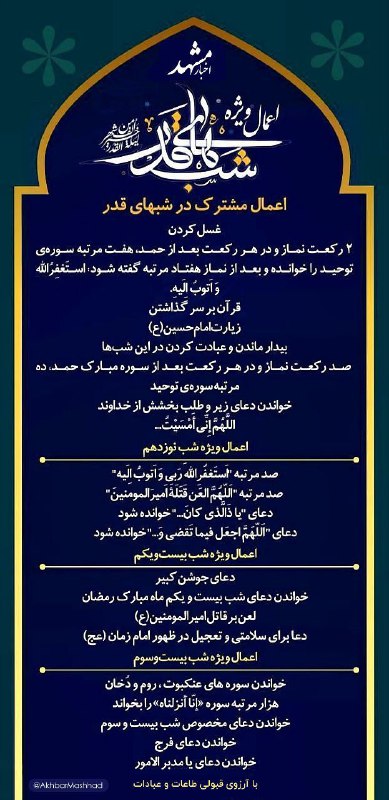 اعمال ویژه شبهای قدر برای جلوگیری از عذاب تا سال آینده Posted on مارس 10, 2026 📷اعمال ویژه شبهای قدر 🔹«کسى که شب قدر را زنده بدارد، عذاب تا سال آینده از او روى میگرداند»