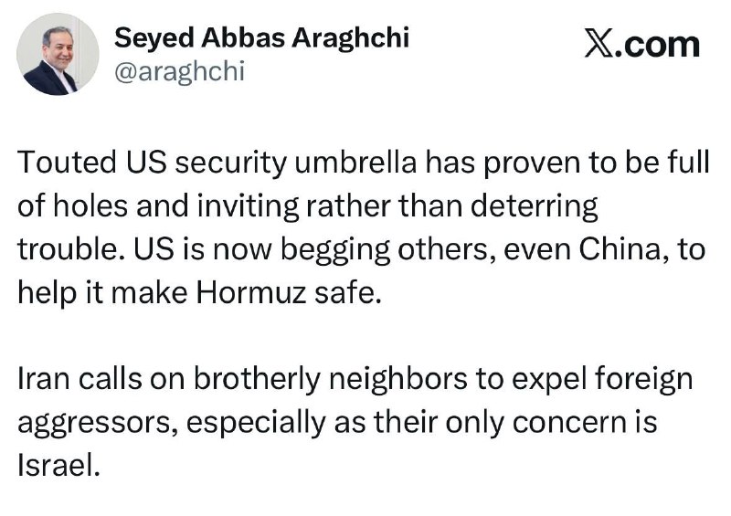 🔸سید عباس عراقچی: ایران از برادران همسایه خود می‌خواهد نیروهای متجاوز خارجی را
