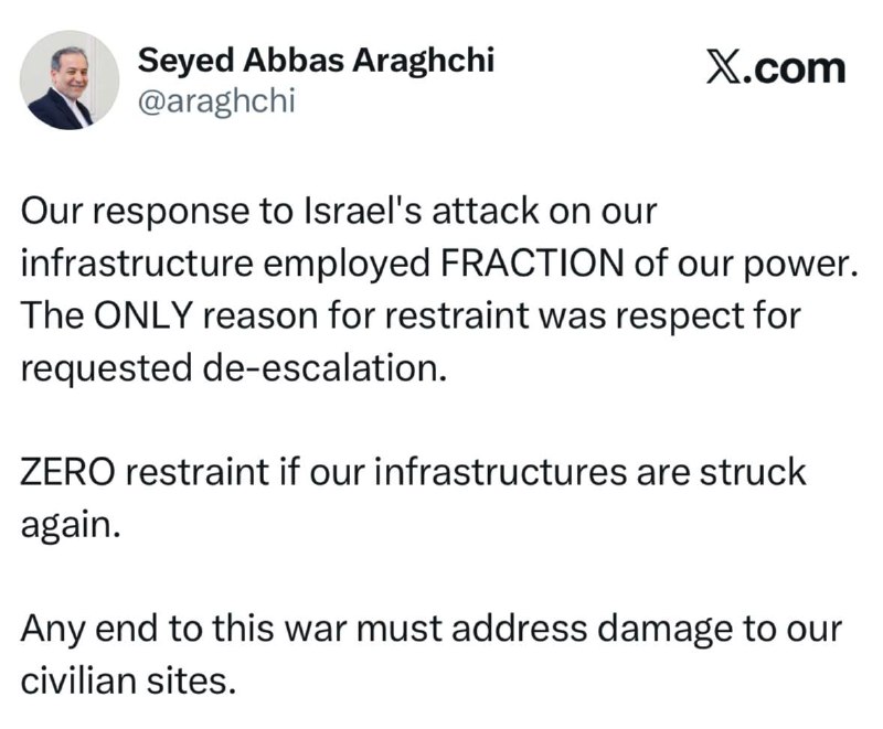 🔸هشدار عراقچی: اگر حمله به زیرساختهای ما تکرار شود دیگر هیچ خویشتنداری وجود
