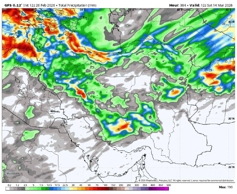 🌧️آپدیت جدید مدل GFS; مجموع احتمالی بارش باران و برف طی ۱۶ روز آینده