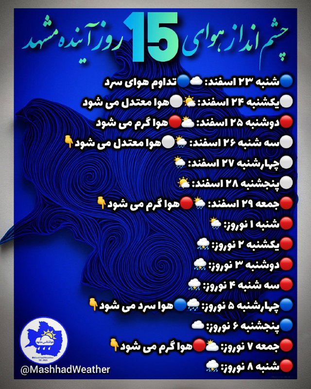 👁️ چشم انداز هوای ۱۵ روز آینده مشهد❄️هواشناسی خصوصی Posted on مارس 20, 2026 👁️ چشم انداز هوای ۱۵ روز آینده مشهد ❄️هواشناسی خصوصی مشهد👇 @MashhadWeather