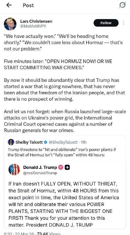 🔹پنج دقیقه بعد: «همین حالا تنگه هرمز را باز کنید! وگرنه دست به جنایت جنگی