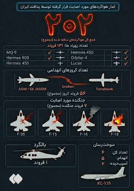 آمار دقیق ساقط شدن ۲۰۲ هواگرد توسط پدافند ایران تا کنون Posted on مارس 25, 2026 🔸 آمار هواگردهای مورد اصابت قرار گرفته توسط پدافند ایران 🔹 ۲۰۲ هواگرد ساقط شده تا این لحظه