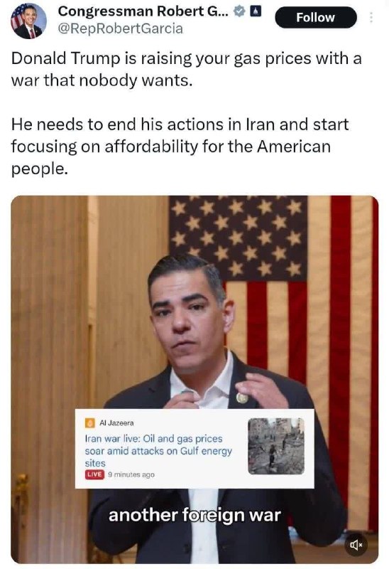 🔸رابرت گارسیا، عضو مجلس نمایندگان آمریکا: ترامپ با راه انداختن جنگی که هیچکس