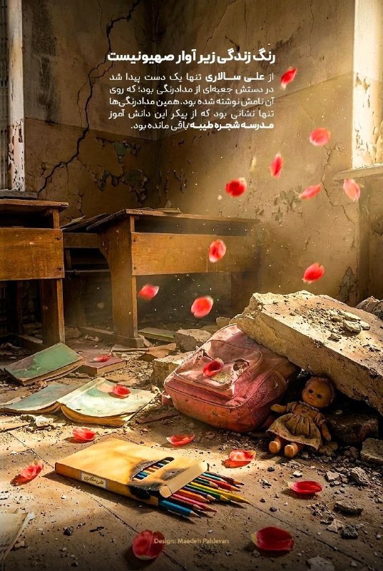 راز مدادرنگیهای دانشآموز شهید مدرسه شجره طیبه | روایتهای مائده پهلوان Posted on مارس 26, 2026 🔸 همین مدادرنگیها، تنها نشانی بود که از پیکر این دانشآموز مدرسه شجره طیبه باقی ماند 🔹طرح از مائده پهلوان 🔹چند روایت از شهدای مدرسه میناب؛ 🔹 «علی را از مداد رنگیهای توی دستش شناسایی کردم»