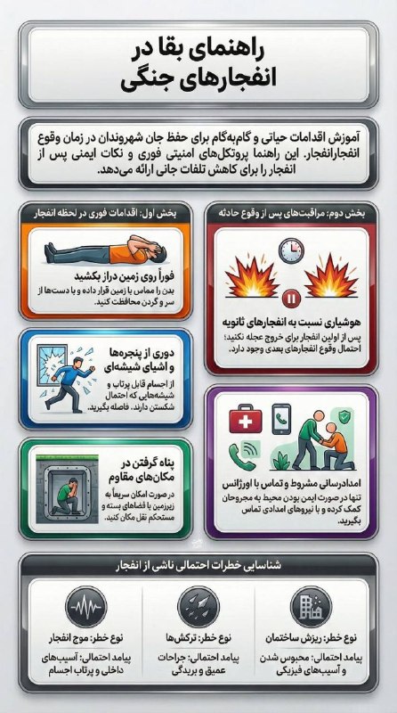 راهنمای کامل اقدامات فوری هنگام وقوع انفجار جنگی نزدیک شما Posted on مارس 26, 2026 🔸 در مواجهه با وقوع انفجار جنگی در نزدیکی خودمان چه کارکنیم ؟