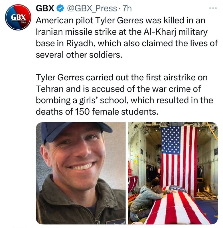 🔸خلبان آمریکایی تایلر گرس در حمله موشکی ایران به پایگاه نظامی الخرج در ریاض