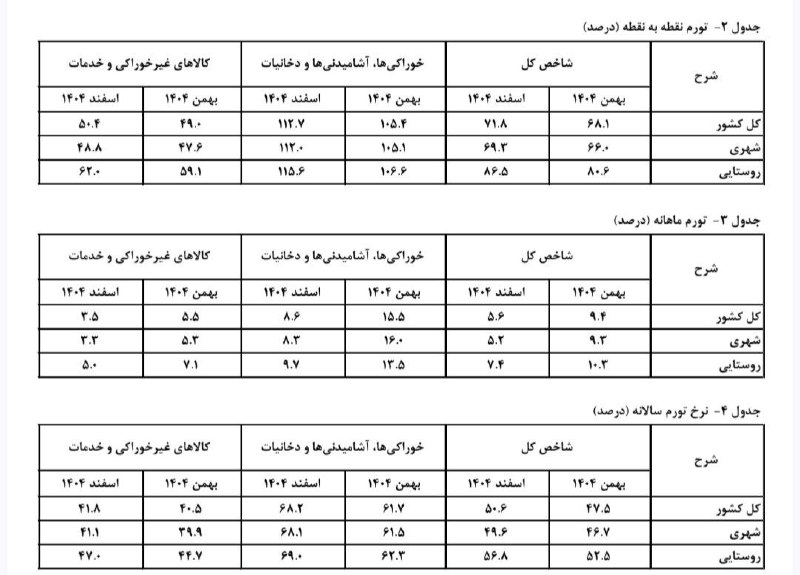 جزئیات کامل آمار تورم اسفند ۱۴۰۴ | نرخ تورم نقطه به نقطه و تورم خوراکیها Posted on مارس 29, 2026 🔸 جزئیات آمار تورم اسفند ۱۴۰۴ اعلام شد 🔹نرخ تورم نقطه به نقطه به ۷۱.۸ درصد رسید. 🔹تورم خوراکیها نیز ۱۱۲.۷ درصد شد.