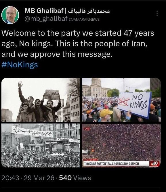 رئیس مجلس شورای اسلامی، در واکنش به برگزاری اعتراضات «No Kings» در آمریکا نوشت: