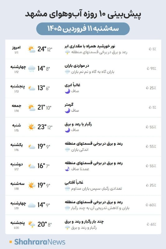 پیشبینی دقیق ۱۰ روزه هوای مشهد | akhbaaremashhad.ir Posted on مارس 31, 2026 🔸 پیشبینی ۱۰ روزه هوای مشهد |akhbaaremashhad.ir [http://akhbaaremashhad.ir/]