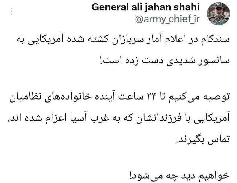 🔸 فرمانده نیروی زمینی ارتش به خانواده نظامیان آمریکایی توصیه کرد تا ۲۴ ساعت