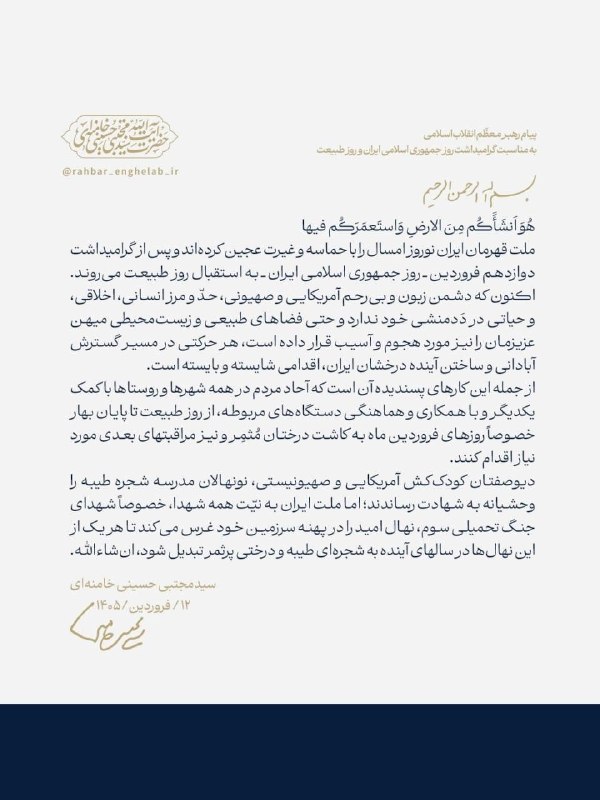 پیام رهبر انقلاب به مناسبت روز جمهوری اسلامی و روز طبیعت: تاکید بر کاشت درخت و آبادانی ایران
