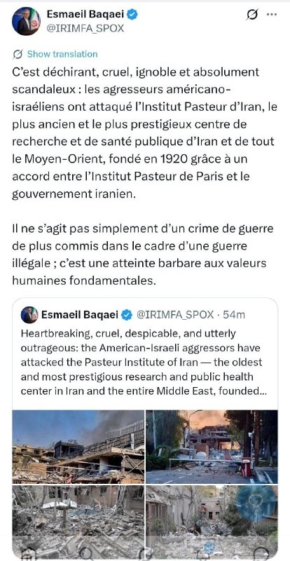 صهیونیستی در حمله به انستیتو پاستور ایران، در شبکه ایکس نوشت: دلخراش، بیرحمانه،