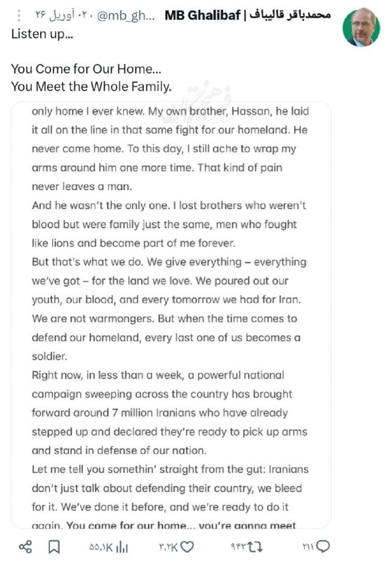 🔸 قاليباف: اگر به خانه ما تعرض کنی با تمام خانواده روبهرو میشوی؛ آماده، مسلح