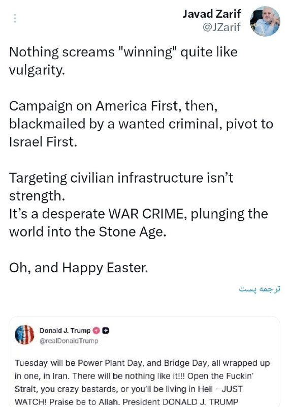 🔸 ظریف در واکنش به توهین ترامپ علیه ایرانیان: حرفهای رکیک، نشانه «پیروزی»