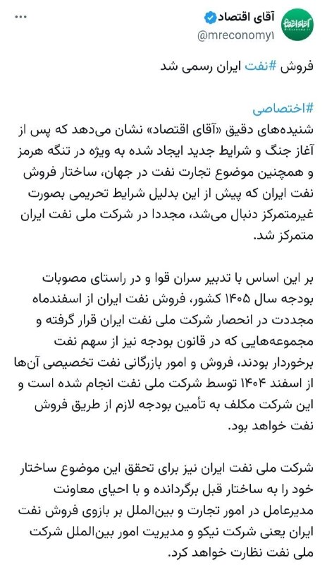 فروش رسمی نفت ایران به شرکت ملی نفت ایران از اسفند ۱۴۰۴: بازگشت ساختار متمرکز فروش نفت