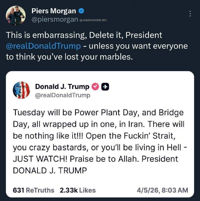 واکنش مجری مشهور انگلیس به تهدید ترامپ علیه زیرساختهای ایران: هشدار به پاک کردن پستها Posted on آوریل 5, 2026 🔸واکنش مجری مشهور انگلیس به تهدید ترامپ علیه زیرساختهای ایران: این پست را پاک کن! مگر اینکه بخواهی فکر کنن روانی هستی