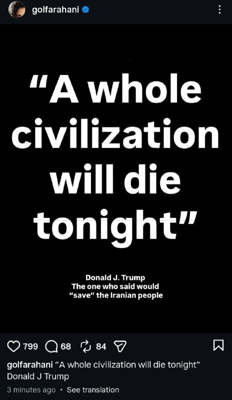 واکنش گلشیفته فراهانی به تهدیدات ترامپ علیه ایران: نقدی بر ادعای «نجات» مردم ایران Posted on آوریل 7, 2026 🔸 واکنش گلشیفته فراهانی به تهدید ترامپ علیه ایران 🔹 امشب یک تمدن کامل خواهد مرد – 🔹 دونالد ترامپ؛ همان کسی که گفت مردم ایران را «نجات» میدهد