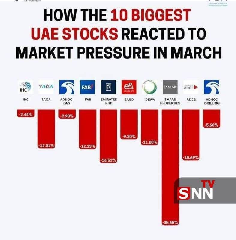 کاهش ۲ الی ۳۵ درصدی ارزش سهام ۱۰ شرکت بزرگ امارات پس از تجاوز آمریکا و اسرائیل به ایران Posted on آوریل 7, 2026 🔸ارزش سهام ۱۰ مورد از بزرگترین شرکتهای امارات از ابتدای تجاوز آمریکا و اسرائیل به خاک ایران بین ۲ الی ۳۵ درصد سقوط کرده است