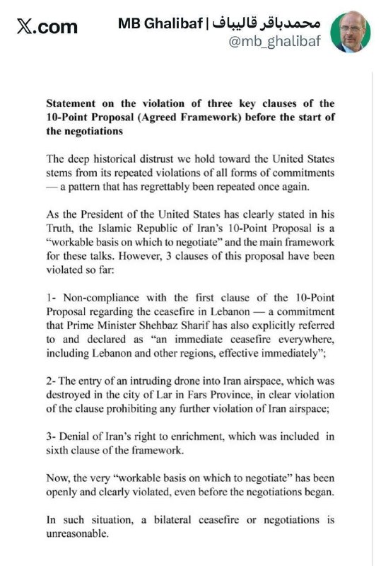 🔹قالیباف تأکید کرد این طرح بهعنوان چارچوب پایه مذاکرات مطرح شده بود، اما با