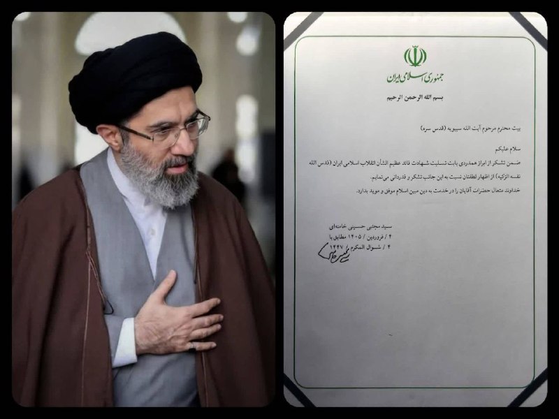 پاسخ آیتالله سیدمجتبی خامنهای به پیام تسلیت و بیعت بیت مرحوم آیتالله سیبویه Posted on آوریل 8, 2026 🔸 پاسخ رهبر معظم انقلاب آیتالله سیدمجتبی خامنهای به پیام تسلیت و بیعت بیت مرحوم آیت الله سیبویه (قدس سره)