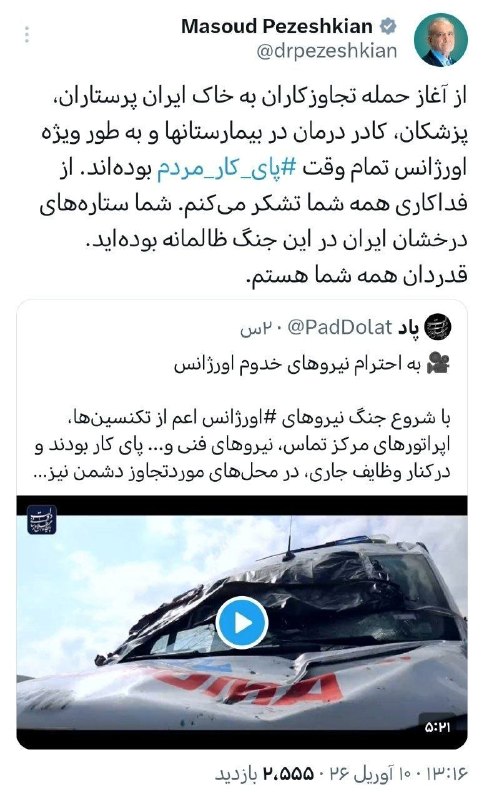 تشکر رئیس‌جمهور از فداکاری پرستاران و کادر درمان اورژانس در دفاع از ایران