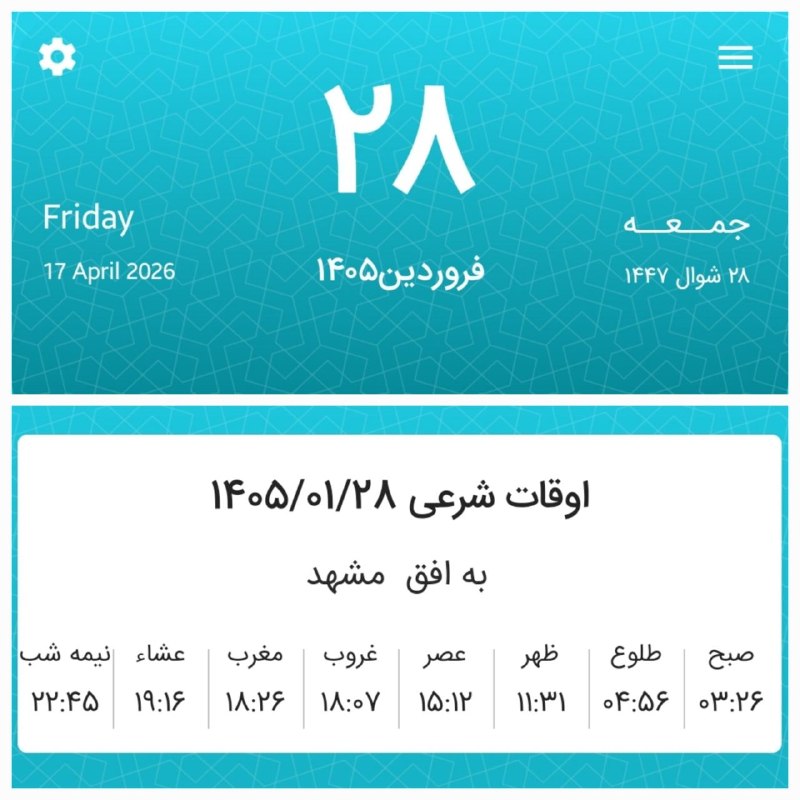 اوقات شرعی جمعه ۲۸ فروردین ۱۴۰۵ به افق مشهد – دقیق و بهروز Posted on آوریل 16, 2026 🔸اوقات شرعی جمعه بیستوهشتم فروردین ماه ۱۴۰۵ به افق مشهد (احتیاط یک تا دو دقیقهای لحاظ شود) 🌱وقت دعا ما رو هم به خاطر داشته باشید🌱 یاحق
