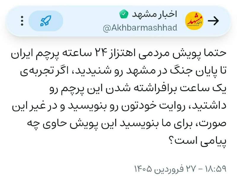 🔸حتما پویش مردمی اهتزاز ۲۴ ساعته پرچم ایران تا پایان جنگ در مشهد رو شنیدید، اگر