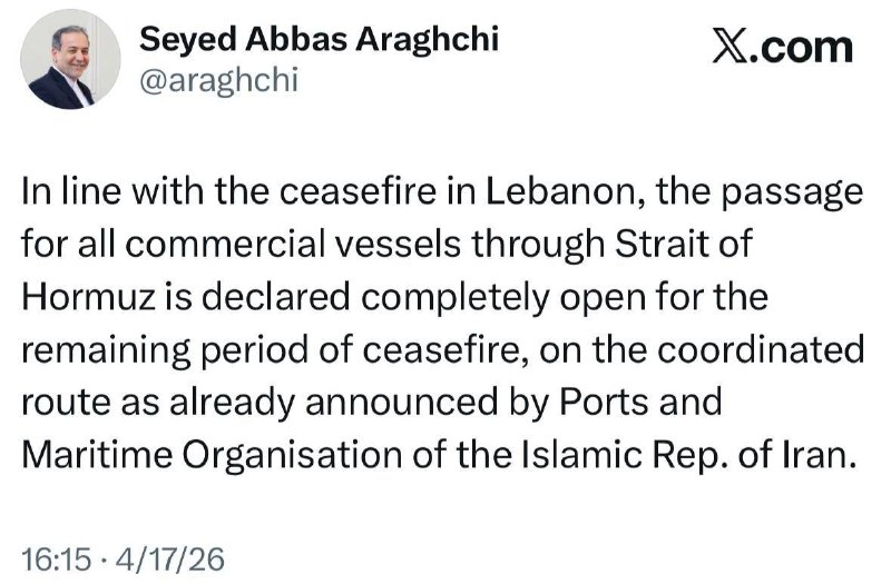🔸اعلام آزادی تردد در تنگه هرمز در دوره باقی مانده از آتش بس توسط وزیر خارجه