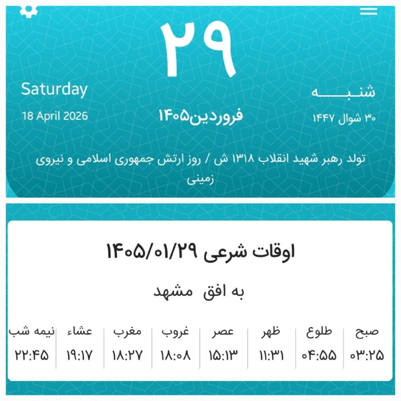 اوقات شرعی شنبه 29 فروردین 1405 به افق مشهد | زمان دقیق نماز و دعا Posted on آوریل 17, 2026 🔸اوقات شرعی شنبه بیستونهم فروردین ماه ۱۴۰۵ به افق مشهد (احتیاط یک تا دو دقیقهای لحاظ شود) 🌱وقت دعا ما رو هم به خاطر داشته باشید🌱 یاحق
