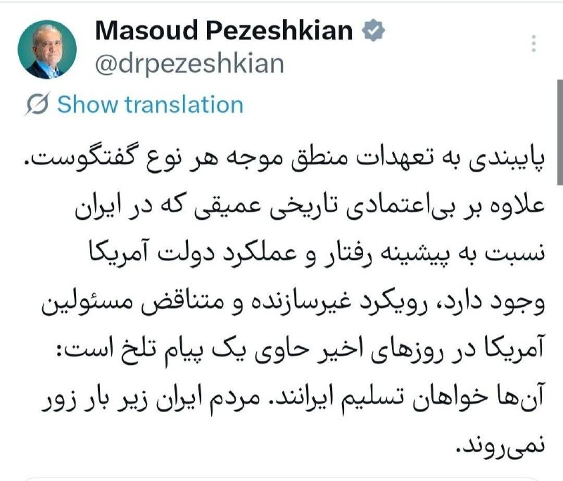 🔸پزشکیان: مردم ایران زیر بار زور نمیروند