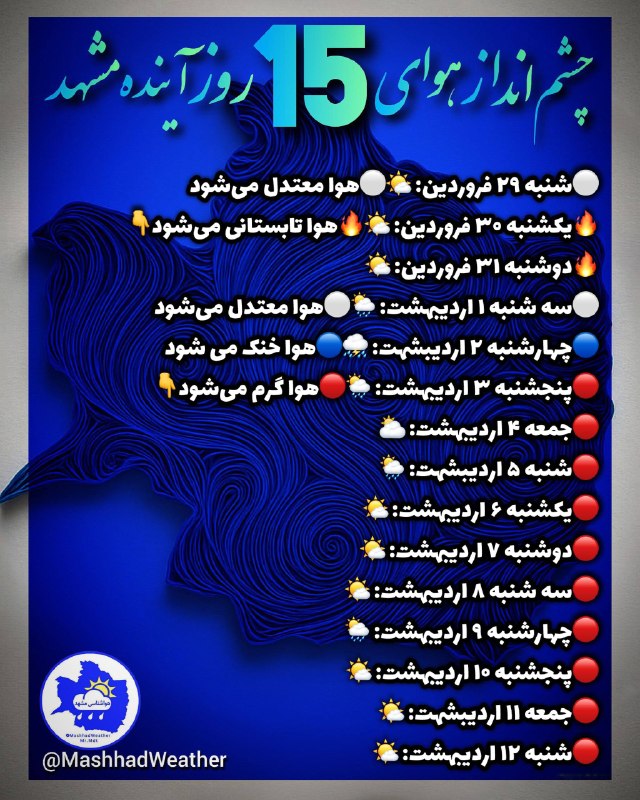 👁️ چشم انداز هوای ۱۵ روز آینده مشهد⛈️هواشناسی خصوصی Posted on آوریل 22, 2026 👁️ چشم انداز هوای ۱۵ روز آینده مشهد ⛈️هواشناسی خصوصی مشهد👇 @MashhadWeather