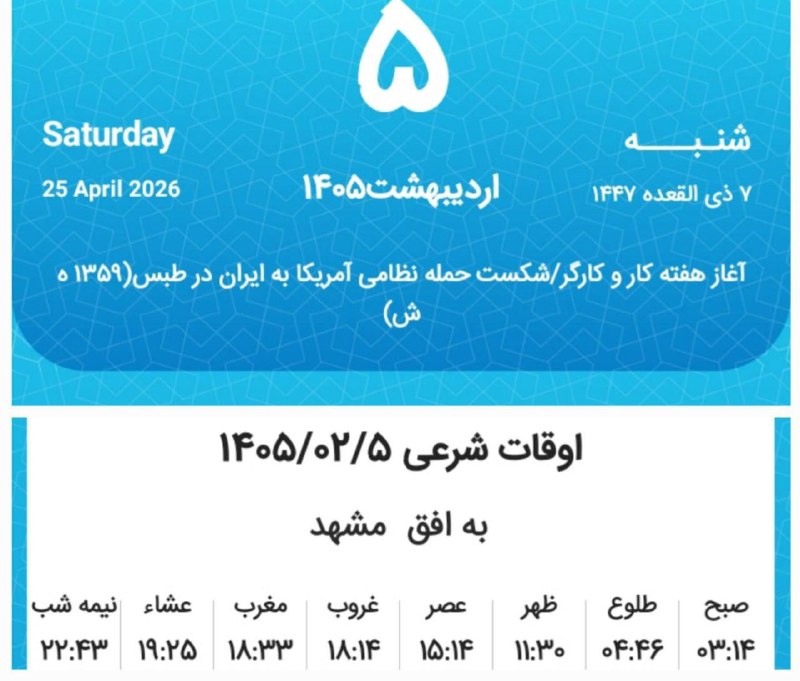 🔸اوقات شرعی شنبه پنجم اردیبهشت ماه ۱۴۰۵ به افق مشهد (احتیاط یک تا دو دقیقه‌ای