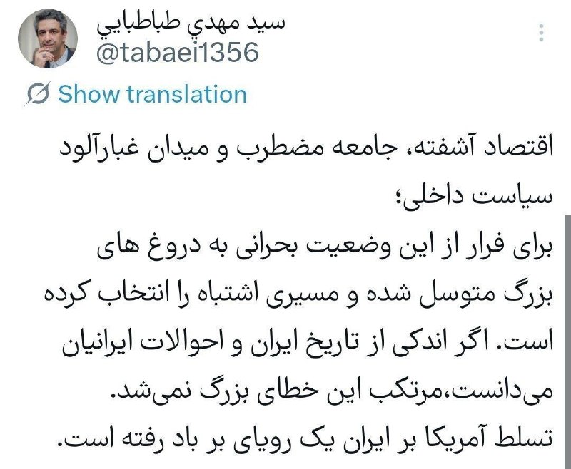 🔸طباطبایی: تسلط آمریکا بر ایران یک رویای بر باد رفته است