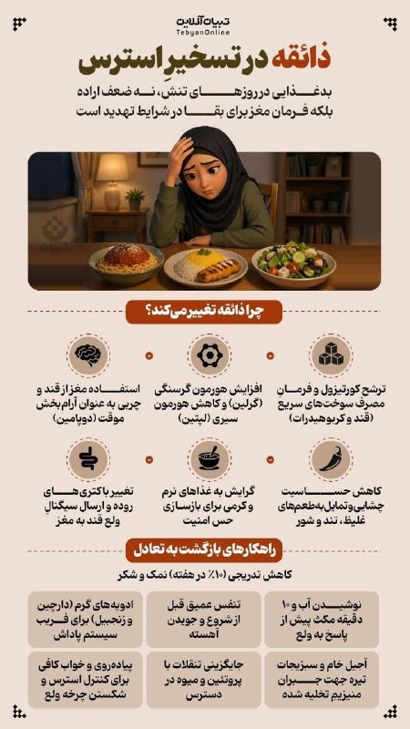 ذائقه و بدغذایی در روزهای استرس: فرمان مغز برای بقا در شرایط تهدید Posted on آوریل 25, 2026 🔸ذائقه در تسخیرِ استرس 🔹بدغذایی در روزهای تنش، نه ضعف اراده؛ بلکه فرمان مغز برای بقا در شرایط تهدید است