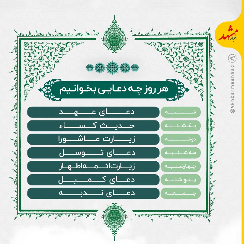 هر روز چه دعایی بخوانیم؟ برنامه هفتگی دعای روزانه از شنبه تا جمعه Posted on آوریل 25, 2026 🔸هر روز چه دعایی بخوانیم؟ 🔹شنبه، #دعای_عهد 🔹یکشنبه، #حدیث_کسا 🔹دوشنبه، #زیارت_عاشورا 🔹سهشنبه، #دعای_توسل 🔹چهارشنبه، #زیارت_نامه_ائمه_اطهار 🔹پنجشنبه، #دعای_کمیل 🔹جمعه، #دعای_ندبه