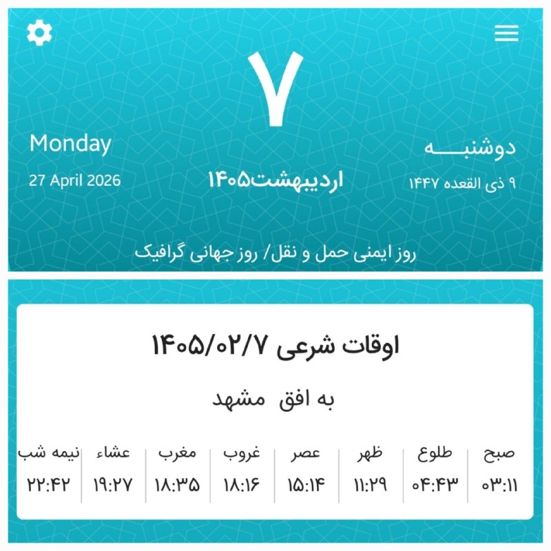 اوقات شرعی دوشنبه ۷ اردیبهشت ۱۴۰۵ به افق مشهد – دقیق و بهروز با احتیاط زمانی Posted on آوریل 26, 2026 🔸اوقات شرعی دوشنبه هفتم اردیبهشت ماه ۱۴۰۵ به افق مشهد (احتیاط یک تا دو دقیقهای لحاظ شود) 🌱وقت دعا ما رو هم به خاطر داشته باشید🌱 یاحق