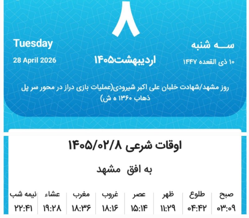 🔸اوقات شرعی سه‌شنبه هشتم اردیبهشت ماه ۱۴۰۵ به افق مشهد (احتیاط یک تا دو