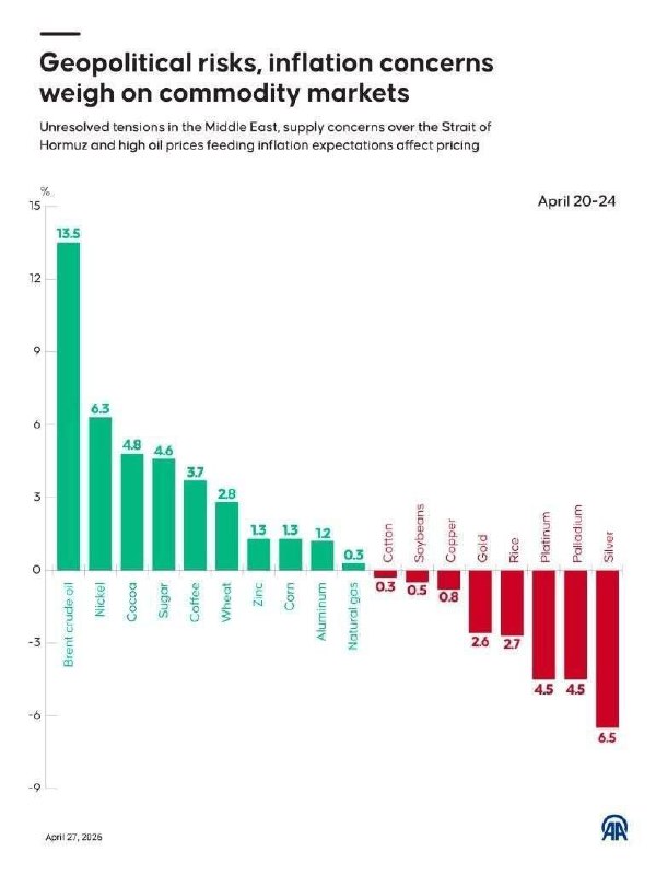 🔹تنها در کمتر از یکهفته اخیر، نفت برنت با ۱۳.۵٪ رشد، بیشترین افزایش را داشت.